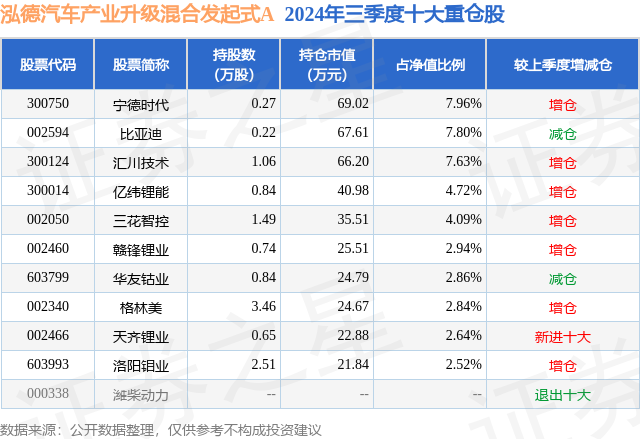 从基金规模来看,泓德汽车产业升级混合发起式A基金2024年三季度公布的基金规模为0.08亿元,较上一期规模665.02万元变化了123.61万元,环比变化了18.59%。该基金最新一期资产配置为:股票占净值比89.37%,债券占净值比1.16%,现金占净值比5.25%。从基金持仓来看,该基金当季前十大股票仓位达46.0%,第一大重仓股为宁德时代(300750),持仓占比为7.96%。
