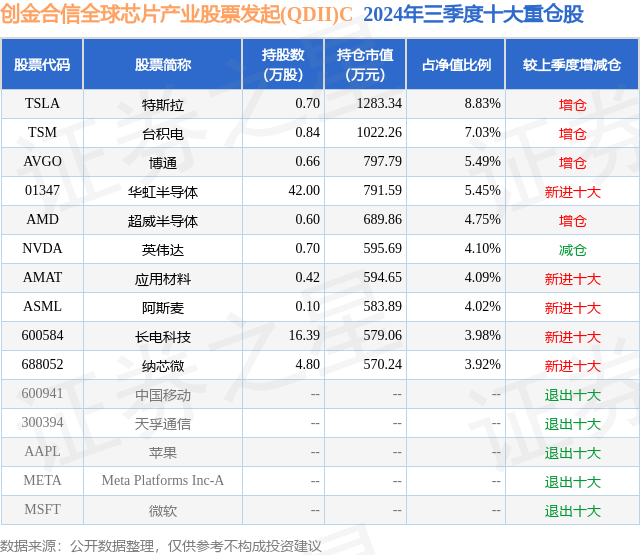 从基金规模来看,创金合信全球芯片产业股票发起(QDII)C基金2024年三季度公布的基金规模为1.26亿元,较上一期规模6345.3万元变化了6268.11万元,环比变化了98.78%。该基金最新一期资产配置为:股票占净值比81.04%,债券占净值比0.98%,现金占净值比19.47%。从基金持仓来看,该基金当季前十大股票仓位达51.66%,第一大重仓股为特斯拉(TSLA),持仓占比为8.83%。