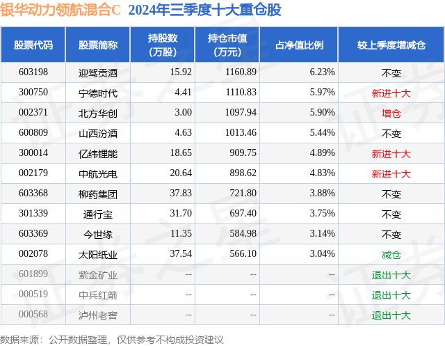 从基金规模来看,银华动力领航混合C基金2024年三季度公布的基金规模为0.51亿元,较上一期规模4829.27万元变化了271.34万元,环比变化了5.62%。该基金最新一期资产配置为:股票占净值比88.52%,无债券类资产,现金占净值比12.32%。从基金持仓来看,该基金当季前十大股票仓位达47.07%,第一大重仓股为迎驾贡酒(603198),持仓占比为6.23%。