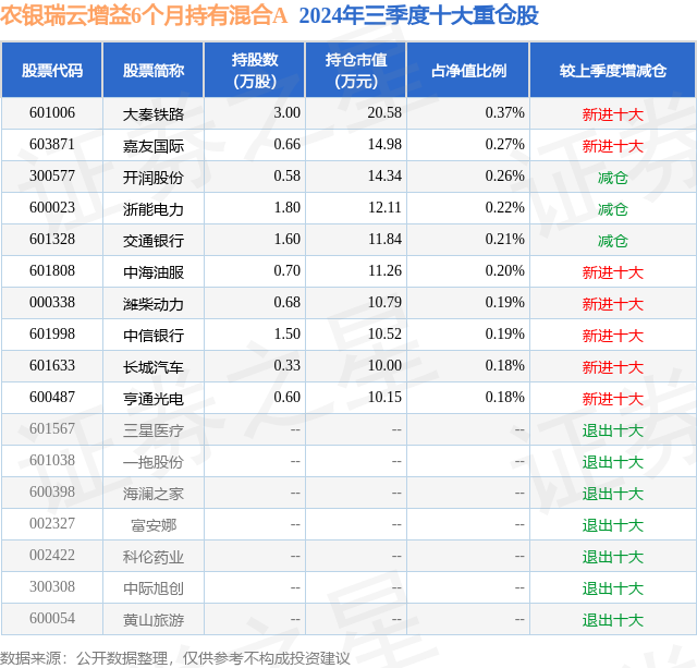 从基金规模来看,农银瑞云增益6个月持有混合A基金2024年三季度公布的基金规模为0.41亿元,较上一期规模5249.73万元变化了-1134.76万元,环比变化了-21.62%。该基金最新一期资产配置为:股票占净值比9.21%,债券占净值比122.16%,现金占净值比2.15%。从基金持仓来看,该基金当季前十大股票仓位达2.27%,第一大重仓股为大秦铁路(601006),持仓占比为0.37%。