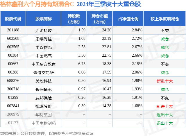 从基金规模来看,格林鑫利六个月持有期混合C基金2024年三季度公布的基金规模为0.08亿元,较上一期规模807.49万元变化了-26.29万元,环比变化了-3.26%。该基金最新一期资产配置为:股票占净值比29.29%,债券占净值比15.56%,现金占净值比54.01%。从基金持仓来看,该基金当季前十大股票仓位达22.6%,第一大重仓股为力诺特玻(301188),持仓占比为2.84%。