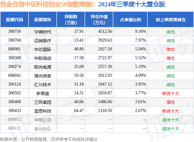 从基金规模来看,创金合信中证科创创业50指数增强C基金2024年三季度公布的基金规模为2.68亿元,较上一期规模2.37亿元变化了3066.39万元,环比变化了12.94%。该基金最新一期资产配置为:股票占净值比94.66%,无债券类资产,现金占净值比1.89%。从基金持仓来看,该基金当季前十大股票仓位达51.27%,第一大重仓股为宁德时代(300750),持仓占比为9.16%。