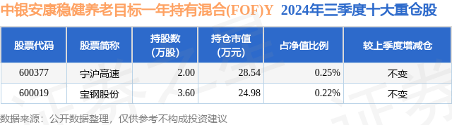 从基金规模来看,中银安康稳健养老目标一年持有混合(FOF)Y基金2024年三季度公布的基金规模为0.08亿元,较上一期规模747.72万元变化了22.6万元,环比变化了3.02%。该基金最新一期资产配置为:股票占净值比0.47%,债券占净值比5.07%,现金占净值比7.22%。从基金持仓来看,该基金当季前十大股票仓位达0.47%,第一大重仓股为宁沪高速(600377),持仓占比为0.25%。