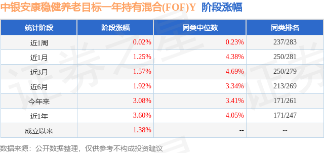 从业绩表现来看,中银安康稳健养老目标一年持有混合(FOF)Y基金过去一年净值涨幅为3.6%,在同类基金中排名171/247,同类基金过去一年净值涨幅中位数为4.05%。而基金过去一年的最大回撤为-2.75%,成立以来的最大回撤为-5.38%。