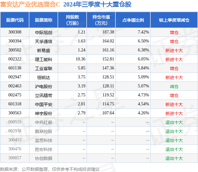 从基金规模来看,富安达产业优选混合C基金2024年三季度公布的基金规模为0.09亿元,较上一期规模881.18万元变化了-13.89万元,环比变化了-1.58%。该基金最新一期资产配置为:股票占净值比90.32%,无债券类资产,现金占净值比8.72%。从基金持仓来看,该基金当季前十大股票仓位达55.88%,第一大重仓股为中际旭创(300308),持仓占比为7.42%。