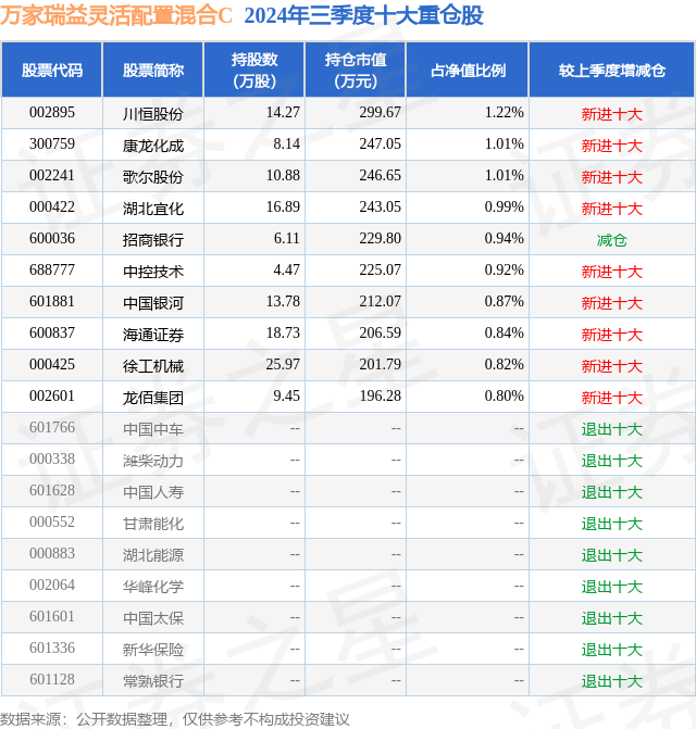 从基金规模来看,万家瑞益灵活配置混合C基金2024年三季度公布的基金规模为2.06亿元,较上一期规模2.12亿元变化了-581.43万元,环比变化了-2.74%。该基金最新一期资产配置为:股票占净值比19.59%,债券占净值比48.39%,现金占净值比2.76%。从基金持仓来看,该基金当季前十大股票仓位达9.42%,第一大重仓股为川恒股份(002895),持仓占比为1.22%。