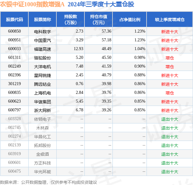 从基金规模来看,农银中证1000指数增强A基金2024年三季度公布的基金规模为0.29亿元,较上一期规模2678.92万元变化了187.25万元,环比变化了6.99%。该基金最新一期资产配置为:股票占净值比94.63%,债券占净值比2.2%,现金占净值比6.66%。从基金持仓来看,该基金当季前十大股票仓位达9.68%,第一大重仓股为电科数字(600850),持仓占比为1.23%。