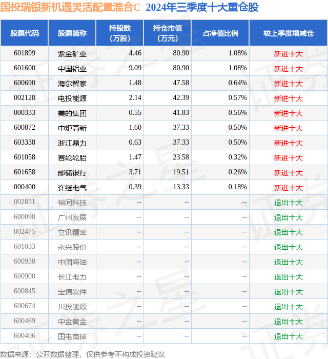 从基金规模来看,国投瑞银新机遇灵活配置混合C基金2024年三季度公布的基金规模为0.39亿元,较上一期规模4005.35万元变化了-110.48万元,环比变化了-2.76%。该基金最新一期资产配置为:股票占净值比5.82%,债券占净值比80.18%,现金占净值比2.45%。从基金持仓来看,该基金当季前十大股票仓位达5.69%,第一大重仓股为紫金矿业(601899),持仓占比为1.08%。