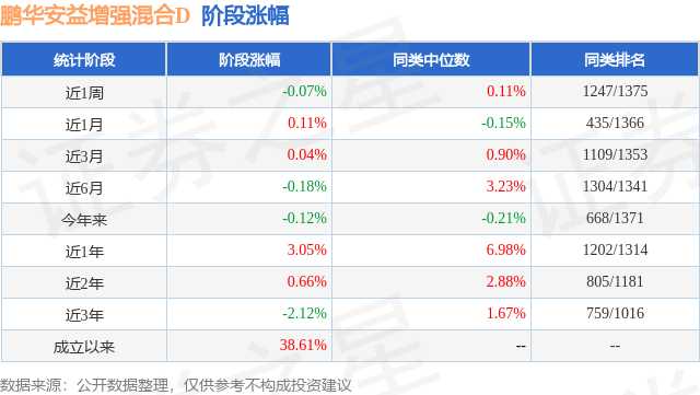 从业绩表现来看,鹏华安益增强混合D基金过去一年净值涨幅为3.33%,在同类基金中排名858/1322,同类基金过去一年净值涨幅中位数为4.43%。而基金过去一年的最大回撤为-1.34%,成立以来的最大回撤为-6.24%。