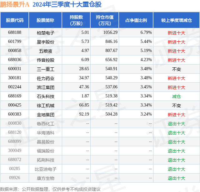 证券之星消息,日前鹏扬景升A基金公布三季报,2024年三季度最新规模1.28亿元,季度净值涨幅为10.33%。