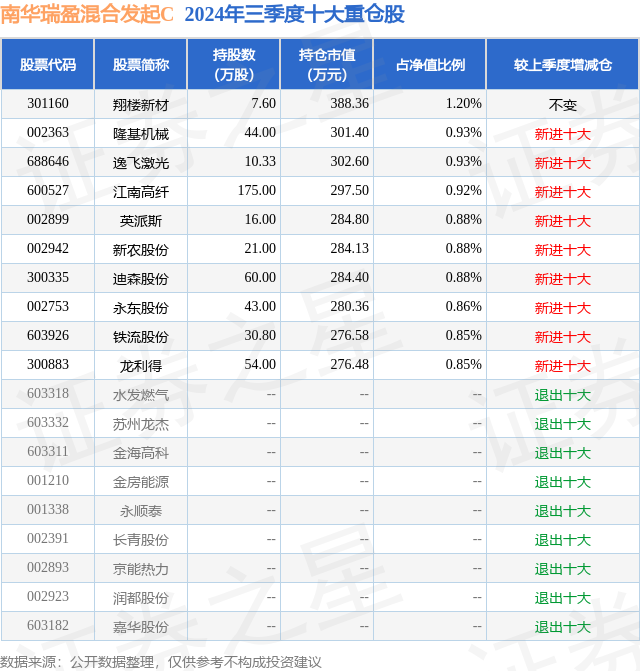 从基金规模来看,南华瑞盈混合发起C基金2024年三季度公布的基金规模为0.28亿元,较上一期规模2641.18万元变化了159.22万元,环比变化了6.03%。该基金最新一期资产配置为:股票占净值比88.53%,无债券类资产,现金占净值比11.69%。从基金持仓来看,该基金当季前十大股票仓位达9.18%,第一大重仓股为翔楼新材(301160),持仓占比为1.2%。
