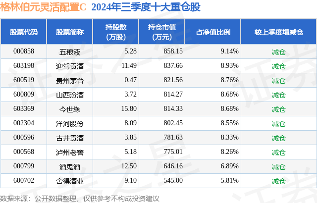 从基金规模来看,格林伯元灵活配置C基金2024年三季度公布的基金规模为0.9亿元,较上一期规模9604.49万元变化了-625.71万元,环比变化了-6.51%。该基金最新一期资产配置为:股票占净值比86.8%,无债券类资产,现金占净值比7.17%。从基金持仓来看,该基金当季前十大股票仓位达82.03%,第一大重仓股为五粮液(000858),持仓占比为9.14%。