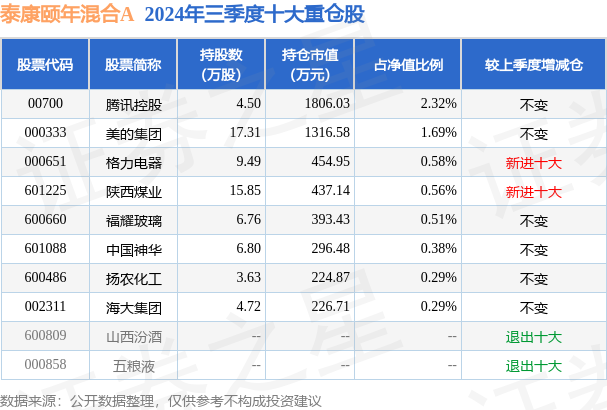 证券之星消息,日前泰康颐年混合A基金公布三季报,2024年三季度最新规模2.19亿元,季度净值涨幅为0.95%。