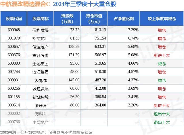 从基金规模来看,中航混改精选混合C基金2024年三季度公布的基金规模为0.96亿元,较上一期规模3854.41万元变化了5770.5万元,环比变化了149.71%。该基金最新一期资产配置为:股票占净值比55.55%,无债券类资产,现金占净值比20.56%。从基金持仓来看,该基金当季前十大股票仓位达48.75%,第一大重仓股为保利发展(600048),持仓占比为7.29%。