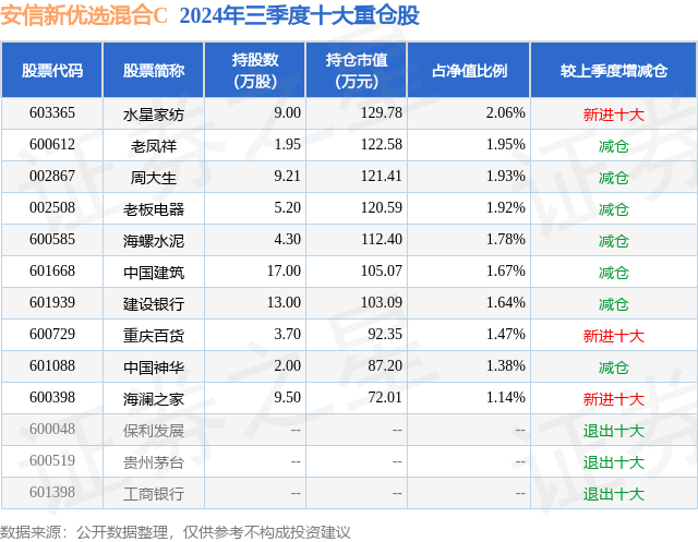 从基金规模来看,安信新优选混合C基金2024年三季度公布的基金规模为0.56亿元,较上一期规模3.26亿元变化了-2.7亿元,环比变化了-82.92%。该基金最新一期资产配置为:股票占净值比29.81%,债券占净值比19.07%,现金占净值比14.22%。从基金持仓来看,该基金当季前十大股票仓位达16.94%,第一大重仓股为水星家纺(603365),持仓占比为2.06%。