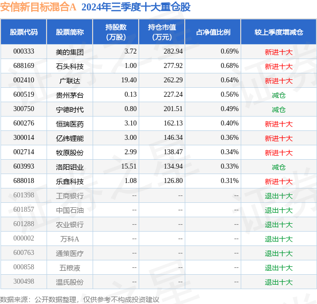 证券之星消息,日前安信新目标混合A基金公布三季报,2024年三季度最新规模1.68亿元,季度净值涨幅为1.62%。