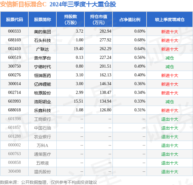 从基金规模来看,安信新目标混合C基金2024年三季度公布的基金规模为2.39亿元,较上一期规模3.56亿元变化了-1.17亿元,环比变化了-32.82%。该基金最新一期资产配置为:股票占净值比6.21%,债券占净值比98.47%,现金占净值比0.79%。从基金持仓来看,该基金当季前十大股票仓位达4.8%,第一大重仓股为美的集团(000333),持仓占比为0.69%。
