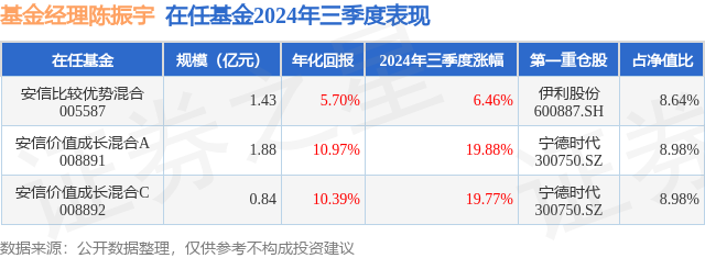 安信比较优势混合现任基金经理为陈振宇 张竞。其中在任基金经理陈振宇已从业8年又66天,2018年3月21日正式接手管理安信比较优势混合,任职期间累计回报为44.16%。目前还管理着3只基金产品(包括A类和C类),其中本季度表现最佳的基金为安信价值成长混合A(008891),季度净值涨幅为19.88%。
