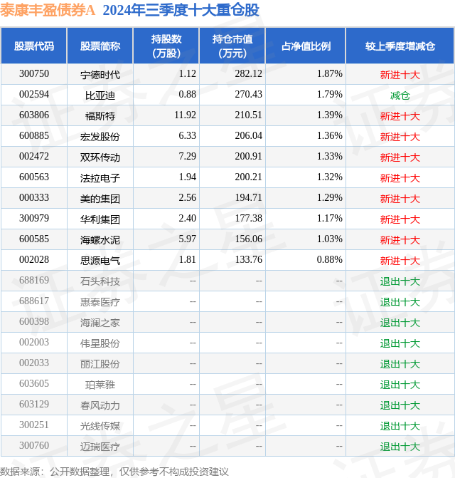 从基金规模来看,泰康丰盈债券A基金2024年三季度公布的基金规模为1.51亿元,较上一期规模1.8亿元变化了-2938.23万元,环比变化了-16.28%。该基金最新一期资产配置为:股票占净值比13.98%,债券占净值比118.02%,现金占净值比0.52%。从基金持仓来看,该基金当季前十大股票仓位达13.43%,第一大重仓股为宁德时代(300750),持仓占比为1.87%。