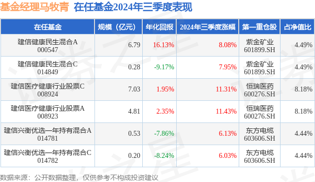 建信健康民生混合A现任基金经理为马牧青。其中在任基金经理马牧青已从业2年又304天,2024年3月29日正式接手管理建信健康民生混合A,任职期间累计回报为4.31%。目前还管理着6只基金产品(包括A类和C类),其中本季度表现最佳的基金为建信医疗健康行业股票A(008923),季度净值涨幅为11.43%。