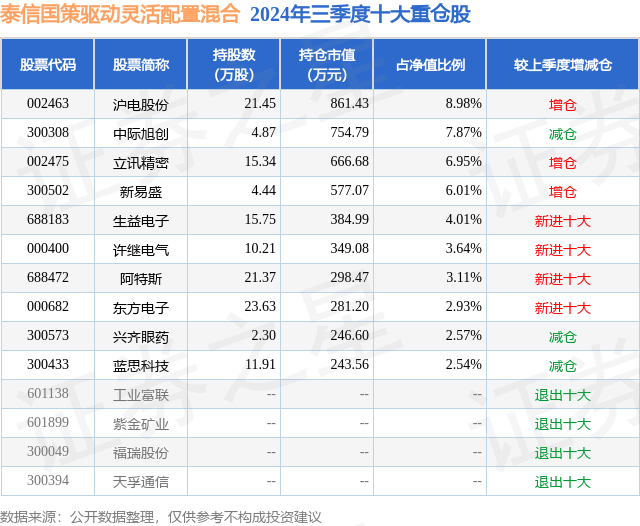 从基金规模来看,泰信国策驱动灵活配置混合基金2024年三季度公布的基金规模为0.96亿元,较上一期规模9773.84万元变化了-177.79万元,环比变化了-1.82%。该基金最新一期资产配置为:股票占净值比64.0%,无债券类资产,现金占净值比36.31%。从基金持仓来看,该基金当季前十大股票仓位达48.61%,第一大重仓股为沪电股份(002463),持仓占比为8.98%。
