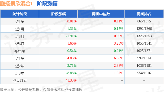 从业绩表现来看,鹏扬景欣混合C基金过去一年净值涨幅为5.19%,在同类基金中排名534/1322,同类基金过去一年净值涨幅中位数为4.43%。而基金过去一年的最大回撤为-6.07%,成立以来的最大回撤为-16.6%。