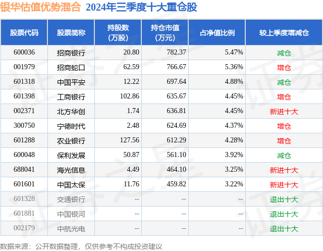 从基金规模来看,银华估值优势混合基金2024年三季度公布的基金规模为1.43亿元,较上一期规模1.22亿元变化了2086.01万元,环比变化了17.08%。该基金最新一期资产配置为:股票占净值比90.55%,无债券类资产,现金占净值比7.19%。从基金持仓来看,该基金当季前十大股票仓位达43.65%,第一大重仓股为招商银行(600036),持仓占比为5.47%。