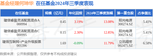 证券之星消息,日前建信睿盈灵活配置混合C基金公布三季报,2024年三季度最新规模0.15亿元,季度净值涨幅为12.85%。