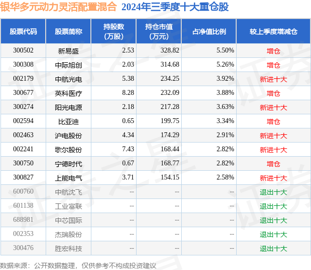 从基金规模来看,银华多元动力灵活配置混合基金2024年三季度公布的基金规模为0.6亿元,较上一期规模5037.93万元变化了942.74万元,环比变化了18.71%。该基金最新一期资产配置为:股票占净值比89.71%,债券占净值比5.42%,现金占净值比3.76%。从基金持仓来看,该基金当季前十大股票仓位达36.66%,第一大重仓股为新易盛(300502),持仓占比为5.5%。
