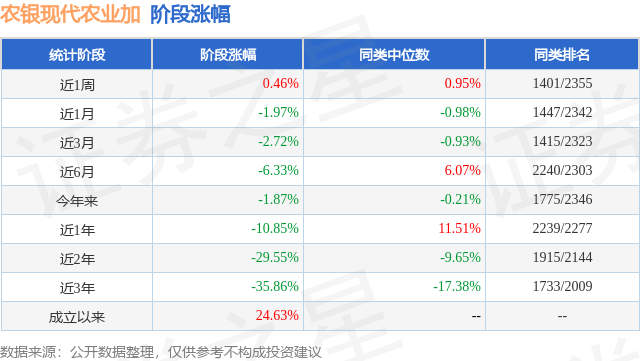 从业绩表现来看,农银现代农业加基金过去一年净值涨幅为-12.99%,在同类基金中排名2201/2261,同类基金过去一年净值涨幅中位数为5.1%。而基金过去一年的最大回撤为-26.63%,成立以来的最大回撤为-51.61%。