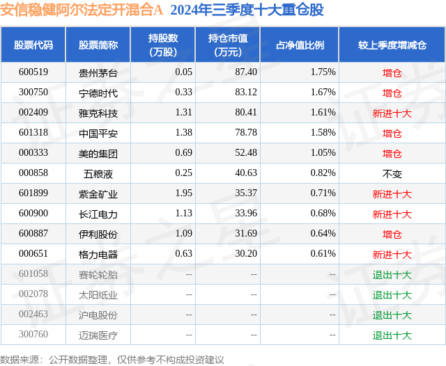 证券之星消息,日前安信稳健阿尔法定开混合A基金公布三季报,2024年三季度最新规模0.3亿元,季度净值涨幅为-4.05%。