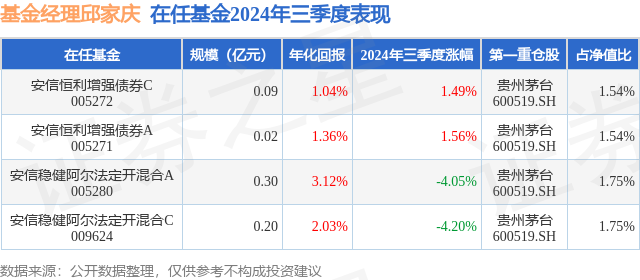 安信稳健阿尔法定开混合A现任基金经理为邱家庆。其中在任基金经理邱家庆已从业1年又46天,2023年9月12日正式接手管理安信稳健阿尔法定开混合A,任职期间累计回报为-3.44%。目前还管理着4只基金产品(包括A类和C类),其中本季度表现最佳的基金为安信恒利增强债券A(005271),季度净值涨幅为1.56%。
