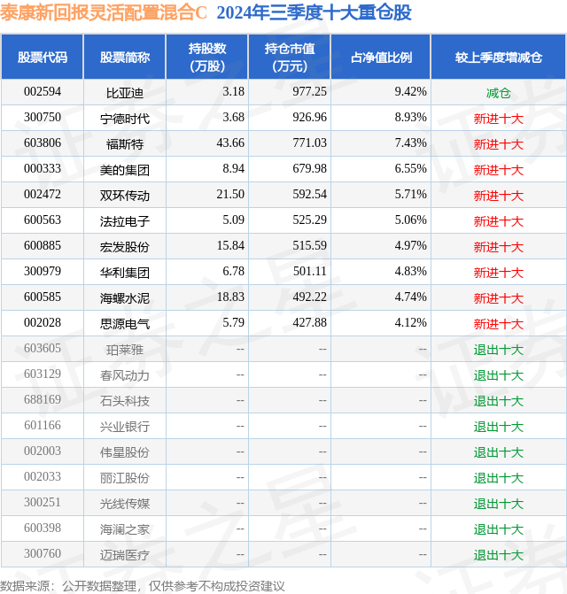 从基金规模来看,泰康新回报灵活配置混合C基金2024年三季度公布的基金规模为0.12亿元,较上一期规模1121.26万元变化了60.92万元,环比变化了5.43%。该基金最新一期资产配置为:股票占净值比85.84%,债券占净值比5.36%,现金占净值比12.68%。从基金持仓来看,该基金当季前十大股票仓位达61.76%,第一大重仓股为比亚迪(002594),持仓占比为9.42%。