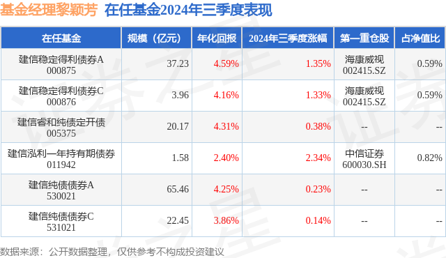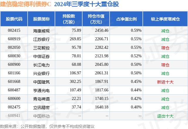 从基金规模来看,建信稳定得利债券C基金2024年三季度公布的基金规模为3.96亿元,较上一期规模4.03亿元变化了-667.84万元,环比变化了-1.66%。该基金最新一期资产配置为:股票占净值比10.76%,债券占净值比102.94%,现金占净值比0.83%。从基金持仓来看,该基金当季前十大股票仓位达4.92%,第一大重仓股为海康威视(002415),持仓占比为0.59%。