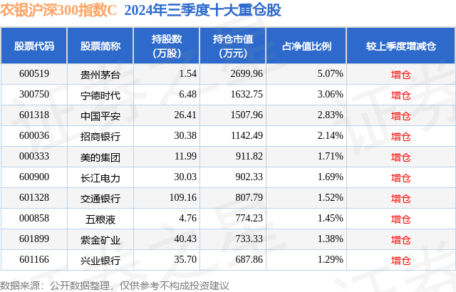 从基金规模来看,农银沪深300指数C基金2024年三季度公布的基金规模为0.15亿元,较上一期规模1572.18万元变化了-30.54万元,环比变化了-1.94%。该基金最新一期资产配置为:股票占净值比94.99%,债券占净值比1.81%,现金占净值比3.19%。从基金持仓来看,该基金当季前十大股票仓位达22.14%,第一大重仓股为贵州茅台(600519),持仓占比为5.07%。