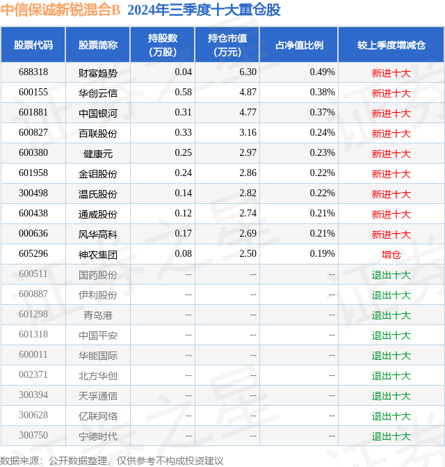 证券之星消息,日前中信保诚新锐混合B基金公布三季报,2024年三季度最新规模0.07亿元,季度净值涨幅为1.91%。