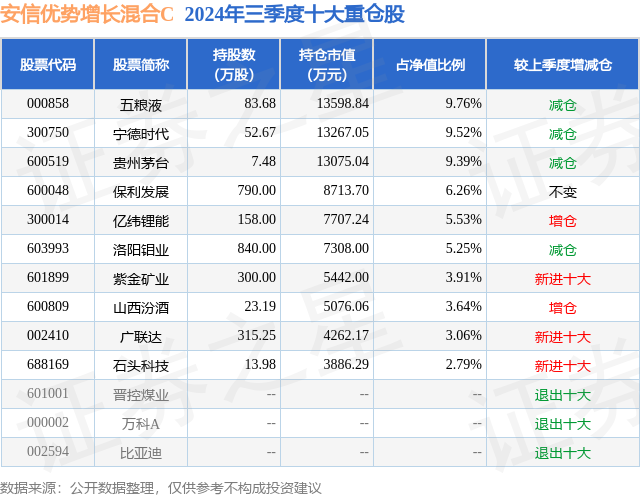 从基金规模来看,安信优势增长混合C基金2024年三季度公布的基金规模为7.66亿元,较上一期规模7.53亿元变化了1262.75万元,环比变化了1.68%。该基金最新一期资产配置为:股票占净值比87.52%,债券占净值比1.56%,现金占净值比9.48%。从基金持仓来看,该基金当季前十大股票仓位达59.11%,第一大重仓股为五粮液(000858),持仓占比为9.76%。