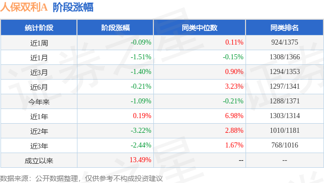 从业绩表现来看,人保双利A基金过去一年净值涨幅为-0.8%,在同类基金中排名1256/1322,同类基金过去一年净值涨幅中位数为4.43%。而基金过去一年的最大回撤为-6.82%,成立以来的最大回撤为-6.82%。