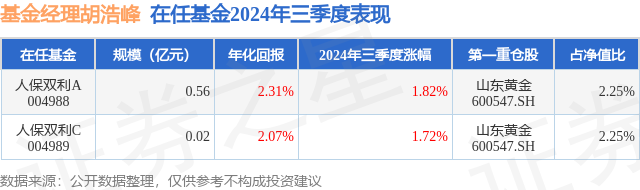 从基金规模来看,人保双利A基金2024年三季度公布的基金规模为0.56亿元,较上一期规模6824.28万元变化了-1216.0万元,环比变化了-17.82%。该基金最新一期资产配置为:股票占净值比29.42%,债券占净值比51.04%,现金占净值比1.66%。从基金持仓来看,该基金当季前十大股票仓位达15.85%,第一大重仓股为山东黄金(600547),持仓占比为2.25%。
