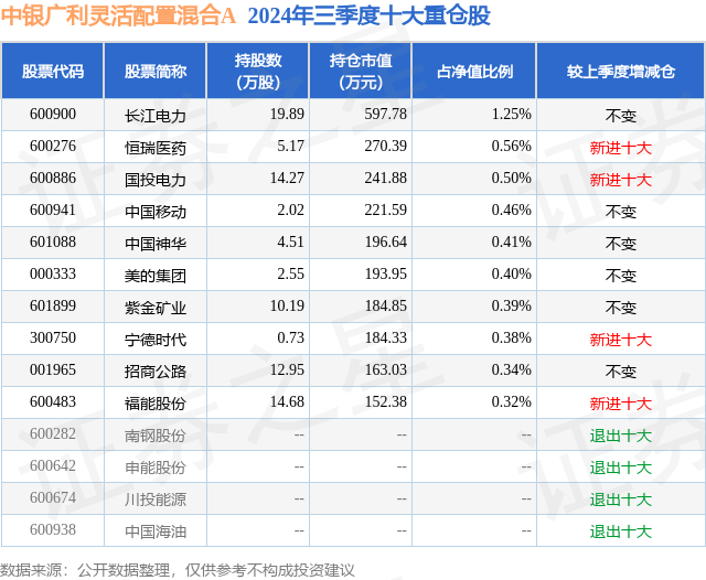 从基金规模来看,中银广利灵活配置混合A基金2024年三季度公布的基金规模为4.76亿元,较上一期规模4.72亿元变化了417.17万元,环比变化了0.88%。该基金最新一期资产配置为:股票占净值比11.97%,债券占净值比89.5%,现金占净值比6.47%。从基金持仓来看,该基金当季前十大股票仓位达5.01%,第一大重仓股为长江电力(600900),持仓占比为1.25%。