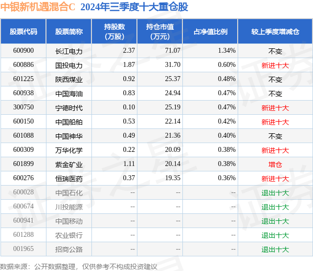 从基金规模来看,中银新机遇混合C基金2024年三季度公布的基金规模为0.3亿元,较上一期规模3332.18万元变化了-325.55万元,环比变化了-9.77%。该基金最新一期资产配置为:股票占净值比9.38%,债券占净值比59.15%,现金占净值比11.62%。从基金持仓来看,该基金当季前十大股票仓位达5.3%,第一大重仓股为长江电力(600900),持仓占比为1.34%。