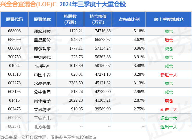 从基金规模来看,兴全合宜混合(LOF)C基金2024年三季度公布的基金规模为9.29亿元,较上一期规模8.41亿元变化了8794.55万元,环比变化了10.45%。该基金最新一期资产配置为:股票占净值比93.33%,债券占净值比3.49%,现金占净值比2.13%。从基金持仓来看,该基金当季前十大股票仓位达36.14%,第一大重仓股为澜起科技(688008),持仓占比为5.18%。