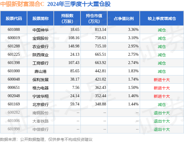 证券之星消息,日前中银新财富混合C基金公布三季报,2024年三季度最新规模0.45亿元,季度净值涨幅为6.93%。
