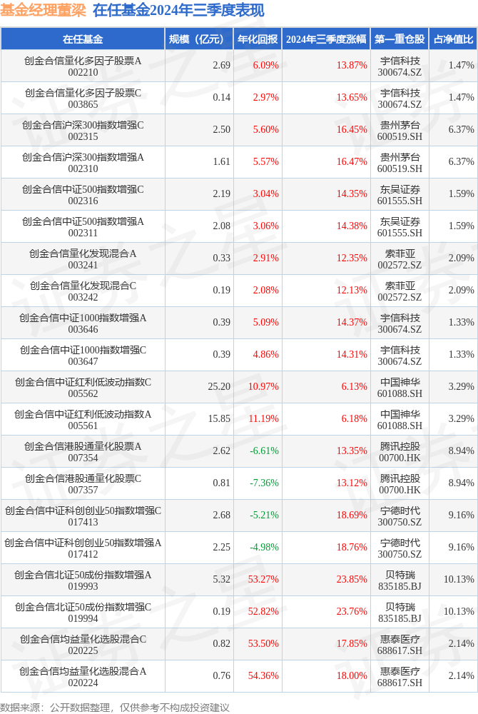 创金合信中证1000指数增强C现任基金经理为董梁 孙悦。其中在任基金经理董梁已从业7年又73天,2019年7月5日正式接手管理创金合信中证1000指数增强C,任职期间累计回报为53.15%。目前还管理着20只基金产品(包括A类和C类),其中本季度表现最佳的基金为创金合信北证50成份指数增强A(019993),季度净值涨幅为23.85%。