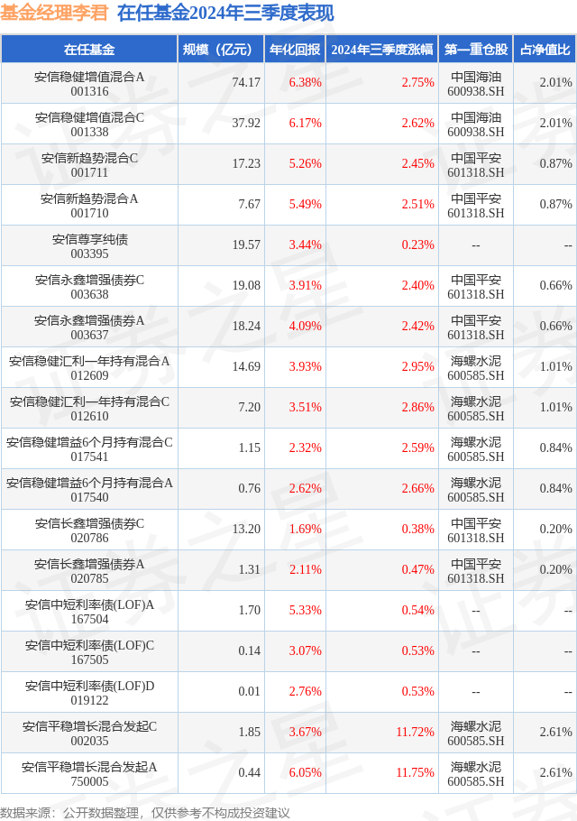 从基金规模来看,安信永鑫增强债券C基金2024年三季度公布的基金规模为19.08亿元,较上一期规模23.64亿元变化了-4.55亿元,环比变化了-19.25%。该基金最新一期资产配置为:股票占净值比13.69%,债券占净值比85.9%,现金占净值比2.91%。从基金持仓来看,该基金当季前十大股票仓位达4.16%,第一大重仓股为中国平安(601318),持仓占比为0.66%。