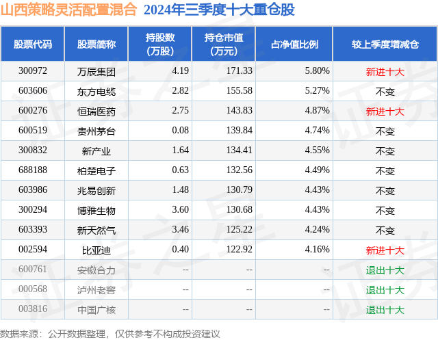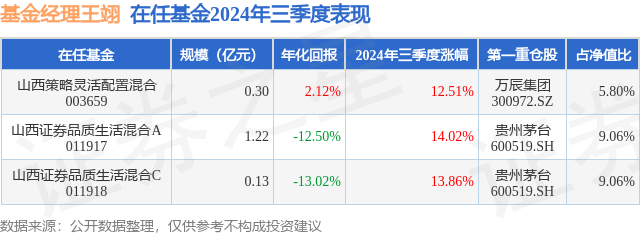 从基金规模来看,山西策略灵活配置混合基金2024年三季度公布的基金规模为0.3亿元,较上一期规模2674.77万元变化了277.84万元,环比变化了10.39%。该基金最新一期资产配置为:股票占净值比89.22%,无债券类资产,现金占净值比10.97%。从基金持仓来看,该基金当季前十大股票仓位达46.98%,第一大重仓股为万辰集团(300972),持仓占比为5.8%。