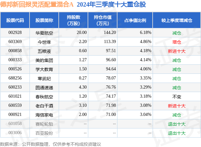 从基金规模来看,德邦新回报灵活配置混合A基金2024年三季度公布的基金规模为0.23亿元,较上一期规模1943.39万元变化了329.24万元,环比变化了16.94%。该基金最新一期资产配置为:股票占净值比94.02%,无债券类资产,现金占净值比5.51%。从基金持仓来看,该基金当季前十大股票仓位达39.36%,第一大重仓股为华夏航空(002928),持仓占比为6.18%。