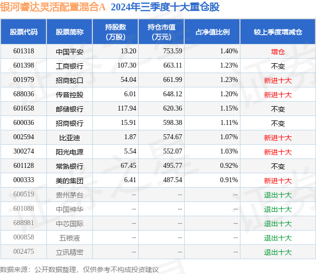 从基金规模来看,银河睿达灵活配置混合A基金2024年三季度公布的基金规模为5.36亿元,较上一期规模5.17亿元变化了1892.29万元,环比变化了3.66%。该基金最新一期资产配置为:股票占净值比25.77%,债券占净值比94.38%,现金占净值比8.42%。从基金持仓来看,该基金当季前十大股票仓位达11.25%,第一大重仓股为中国平安(601318),持仓占比为1.4%。