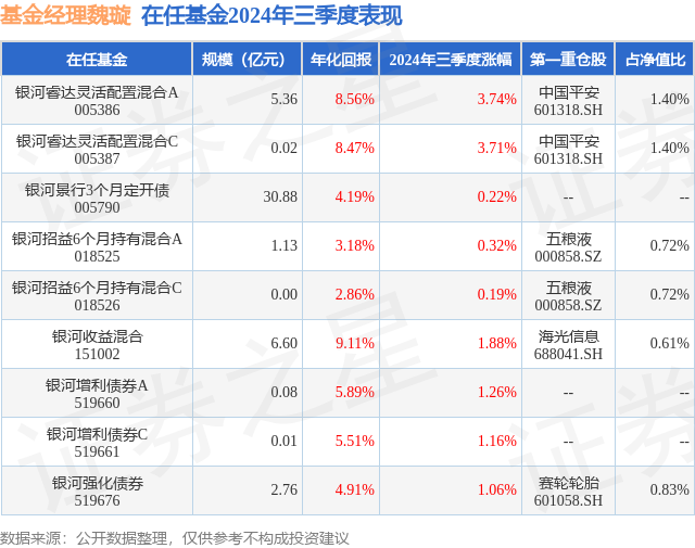 银河睿达灵活配置混合A现任基金经理为魏璇 鲍武斌。其中在任基金经理魏璇已从业2年又252天,2022年2月18日正式接手管理银河睿达灵活配置混合A,任职期间累计回报为0.98%。目前还管理着9只基金产品(包括A类和C类),其中本季度表现最佳的基金为银河睿达灵活配置混合A(005386),季度净值涨幅为3.74%。