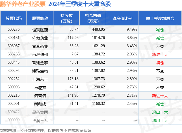 从基金规模来看,鹏华养老产业股票基金2024年三季度公布的基金规模为4.73亿元,较上一期规模4.45亿元变化了2744.07万元,环比变化了6.16%。该基金最新一期资产配置为:股票占净值比84.51%,无债券类资产,现金占净值比15.67%。从基金持仓来看,该基金当季前十大股票仓位达36.33%,第一大重仓股为恒瑞医药(600276),持仓占比为9.49%。